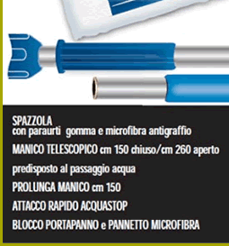 Il kit SOLAR WASH è completo di spazzola con paraurti per evitare danneggiamenti involontari, manico telescopico predisposto per il passaggio dell'acqua al suo interno, prolunga per poter raggiungere la massima estensione, blocco portapanno e panno in microfibra.
