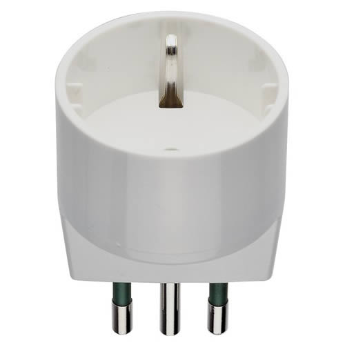 Adattatore 10A schuko bianco - Adattatore semplice SICURY 250 V~, max 1500 W - spina 2P+T 10 A standard italiano tipo S11 - presa 2P+T 16 A standard italiano tipo P30 (contatti di terra laterali e centrale) |
