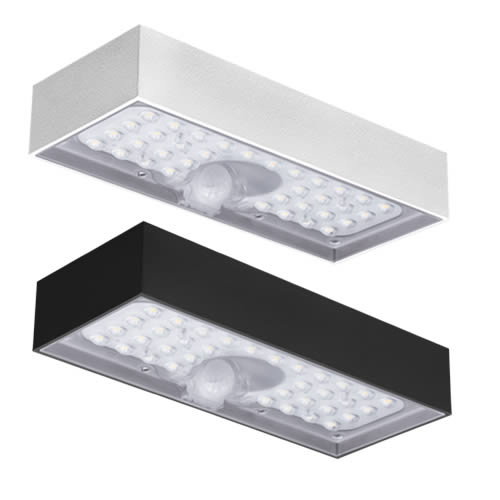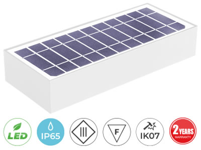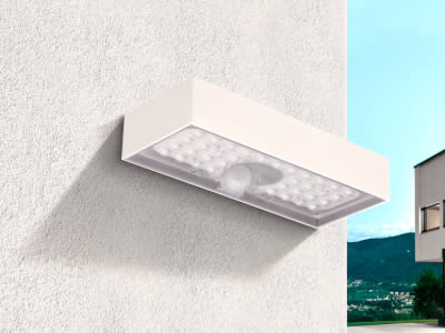 Applique solare Domino da 6W con emissione luminosa singola verso il basso, in modalità “Always On”. Dotata di pannello fotovoltaico monocristallino, sensore crepuscolare e sensore di presenza PIR per l'attivazione solo dopo il tramonto e alla rilevazione di movimento. Il corpo, realizzato in ABS+PC, è protetto da intemperie ed urti grazie ai gradi di protezione IP65 ed IK07.