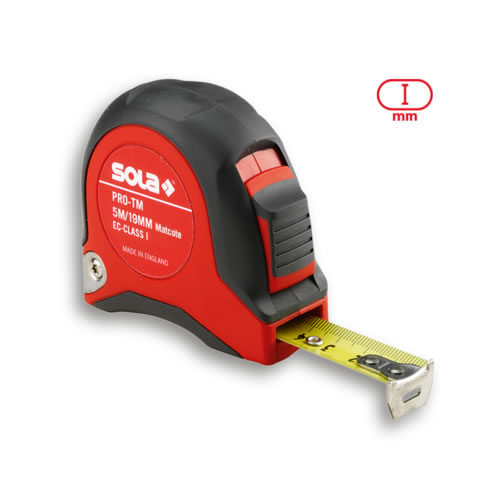 PRO-TM SOLA è un flessometro certificato CE classe I con nastro in acciaio verniciato giallo e rivestimento antiriflesso per una facile lettura. Offre elevata precisione grazie alla stampa digitale della scala e presenta una cassa ergonomica in plastica ABS, con avvolgimento morbido e ammortizzato, e protezione in gomma. Dispone di arresto immediato del nastro e tasto freno gommato per una buona presa. L'estremità del nastro è in acciaio con piastrina rinforzata, mentre l'anello posteriore in metallo permette un aggancio sicuro alla cintura. È ideale per muratori, costruttori in cartongesso, carpentieri e ponteggiatori.