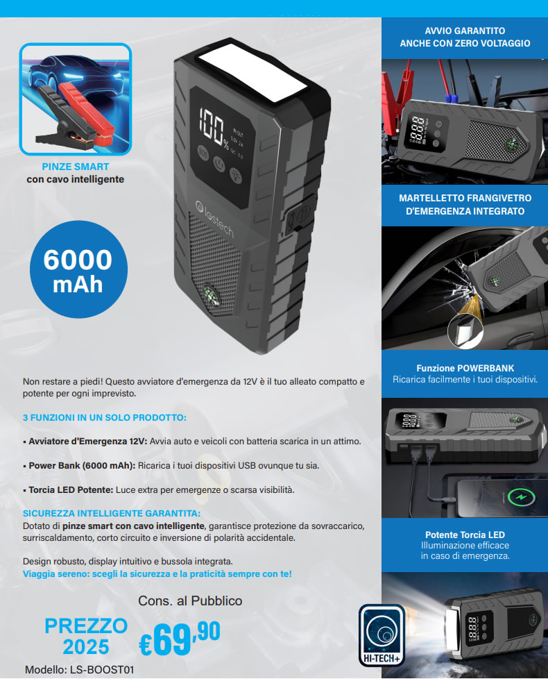 Molte funzioni integrate, come luce Led di emergenza ad alta intensità, che in caso di necessità lo trasformano in una comoda torcia a batteria, Power Bank per la ricarica rapida di dispositivi elettronici (tablet, smartphone, mp3, macchine fotografiche ecc.) via cavo USB (Quick Charge), utile anche come alimentatore portatile di soccorso per i dispositivi a 12V, oltre a un ampio Display digitale molto intuitivo.
