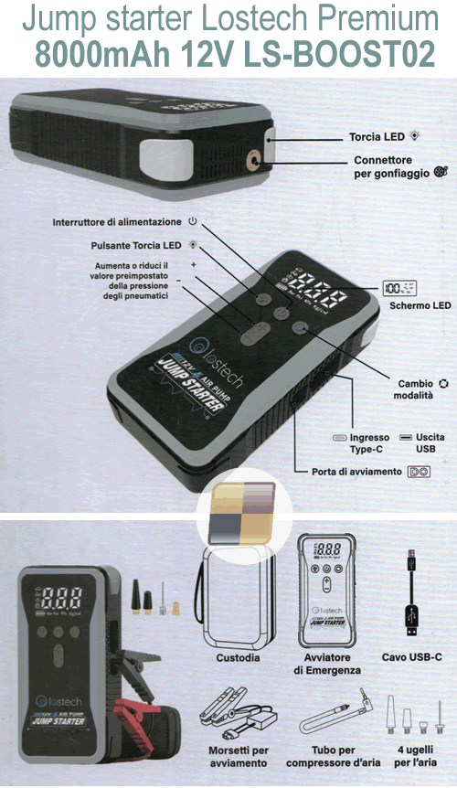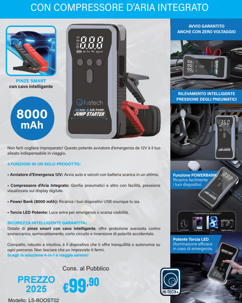 Jump Starter Premium è disponibile da 6000mAh e nella versione da 8000mAh con compressore aria integrato completo di accessori per il gonfiaggio.