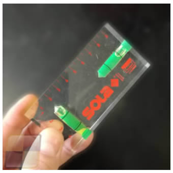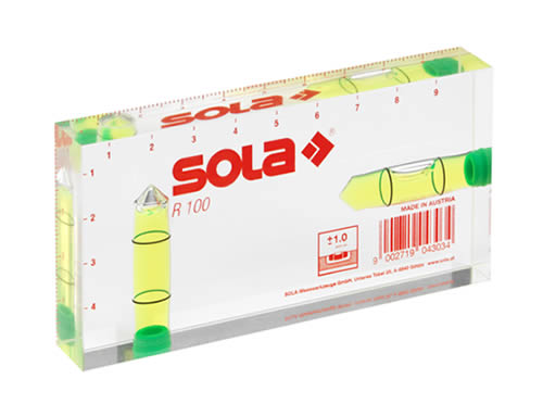 Livello Sola R100 in vetro acrilico trasparente con 2 bolle fresate con sistema CNC. Livella tascabile, piccola e compatta, da tenere sempre a portata di mano. ll vetro acrilico resistente ed elettricamente non conduttivo con il quale è stato realizzato questo livello di precisione a due bolle gli permette di essere posizionato su superfici anche particolarmente delicate senza rischiare di graffiarle. Realizzato con due bolle di ottima qualità e altrettanta ottima precisione, ideale per rilievi orizzontali e verticali.