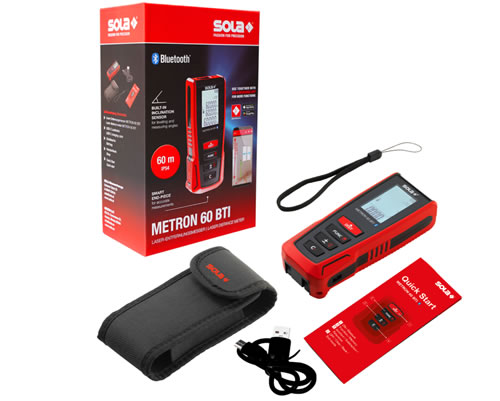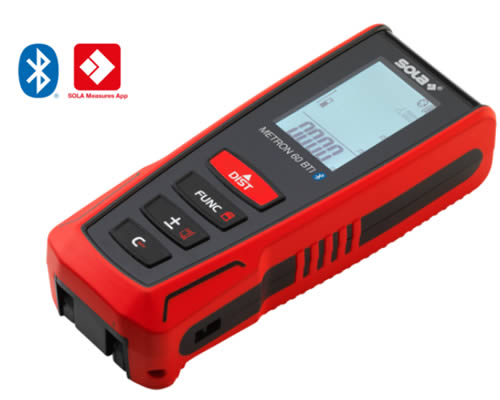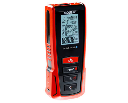Anche il METRON 60 BTI include un'interfaccia Bluetooth per la trasmissione dei dati all'app SOLA Measures e un sensore d'inclinazione per misurazioni angolari. Ha una memoria per 30 valori e un intervallo di misurazione da 0,05 a 60 m. È progettato per calcolare automaticamente le superfici delle pareti e presenta un display illuminato a tre righe. Il dispositivo è anche dotato di una parte terminale pieghevole e una filettatura da 1/4" per il fissaggio su treppiede. Ideale per imbianchini.